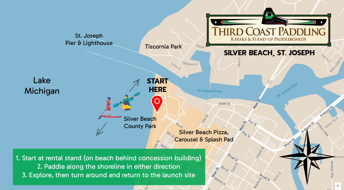 Silver Beach kayak rentals and paddleboard rentals are located on the north end of Silver Beach County Park (behind the concession building and next to the swim area) in St. Joseph, Michigan, within walking distance of downtown St. Joseph.